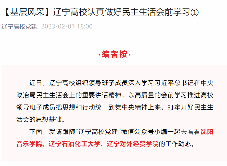 编者按:近日,辽宁高校党建微信公众号对辽宁高校认真做好民主生活会前学习进行了宣传,其中对我校党委理论学习中心组召开会议,深入学习习近平总书记在中央政治局民主生活会上的重要讲话精神等内容作了组稿报道。现将相关报道转载如下: