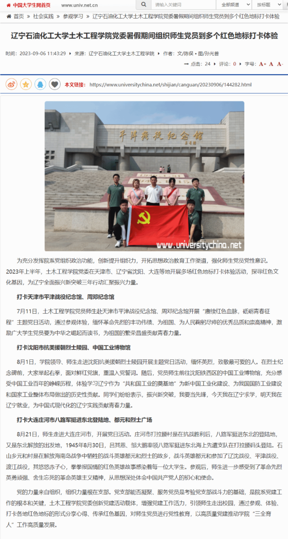 编者按:近日,中国大学生网、辽宁日报·北国号等媒体平台对我校土木工程学院党委暑假期间组织师生党员到多个红色地标打卡体验进行了宣传报道。现将相关报道转载如下: