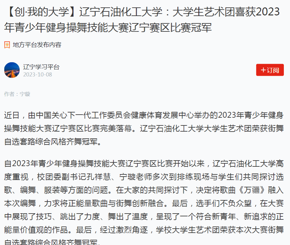 编者按:近日,学习强国辽宁学习平台、人民日报客户端·人民号等媒体平台对我校大学生艺术团喜获2023年青少年健身操舞技能大赛辽宁赛区比赛冠军进行了宣传报道。现将相关报道转载如下: