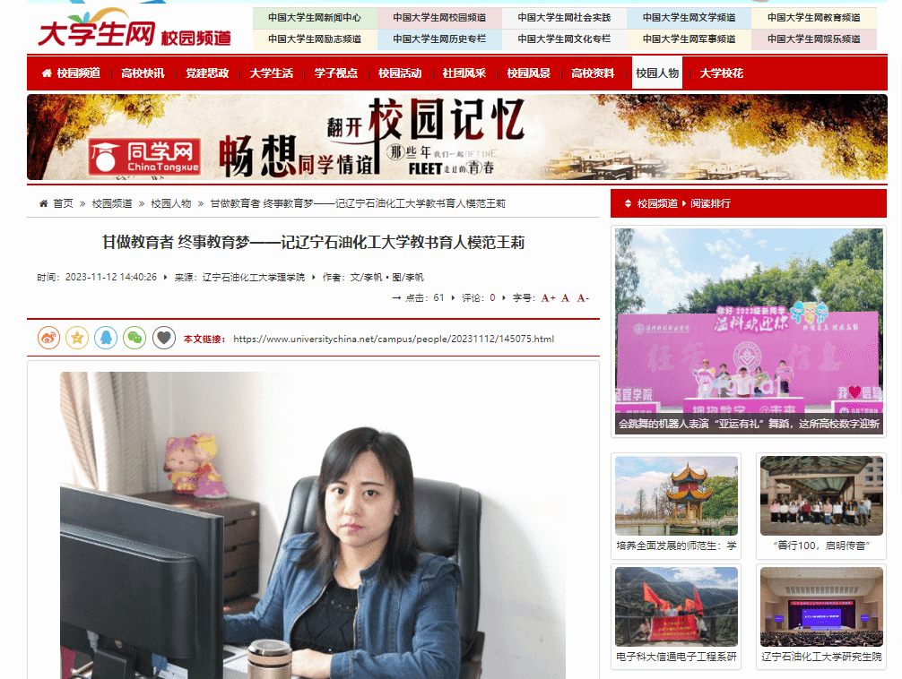 编者按:近日,中国大学生网对我校教书育人模范理学院王莉教授事迹进行了宣传报道。现将相关报道转载如下: