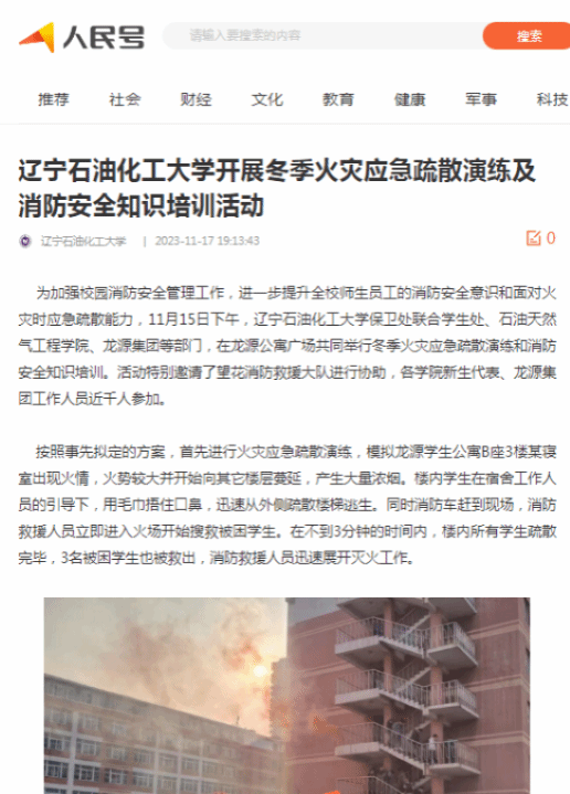 编者按:近日,学习强国辽宁学习平台、人民日报客户端·人民号、辽宁日报·辽望号、中国大学生网对我校为加强校园消防安全管理工作,进一步提升全校师生员工的消防安全意识和面对火灾时应急疏散能力,11月15日下午,保卫处联合学生处、石油天然气工程学院、龙源集团等部门,在龙源公寓广场共同举行冬季火灾应急疏散演练和消防安全知识培训进行了宣传报道。现将相关报道转载如下: