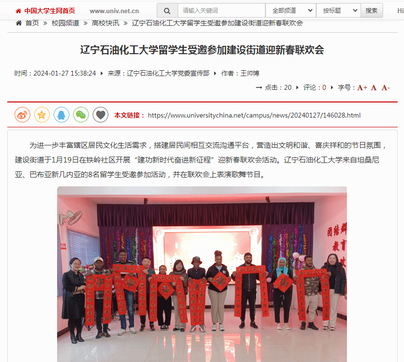 编者按:为进一步丰富辖区居民文化生活需求,搭建居民间相互交流沟通平台,营造出文明和谐、喜庆祥和的节日氛围,建设街道于1月19日在铁岭社区开展“建功新时代奋进新征程”迎新春联欢会活动。我校来自坦桑尼亚、巴布亚新几内亚的8名留学生受邀参加活动,并在联欢会上表演歌舞节目。中国大学生网、辽宁日报·辽望号、人民日报客户端·人民号对此进行了宣传报道。现将相关报道转载如下: