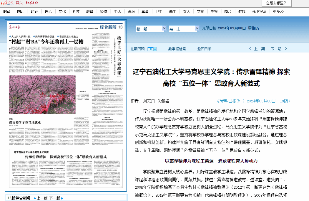 编者按:3月8日,光明日报第13版以《国产亚洲综合一区二区三区_亚洲欧美日韩中文天堂_尤物在线观看视频不卡无码_国产最新精品亚洲2025不卡_亚洲成Av人在线观看片水蜜桃马克思主义学院:传承雷锋精神 探索高校“五位一体”思政育人新范式》为题,对我校60多年来始终将“用雷锋精神建校育人”的办学理念贯穿学校立德树人的全过程。马克思主义学院作为“辽宁省高校示范马克思主义学院”,坚持将学校办学理念与高校思政课建设紧密融合,通过理念创新和机制创新,构建并实施了具有鲜明育人特色的“课程奠基、科研依托、实践锻造、文化熏陶、网络浸润”的雷锋精神“五位一体”思政育人新范式进行了刊发报道。该文由马克思主义学院刘志丹、关佩名撰写。现将相关报道转载如下: