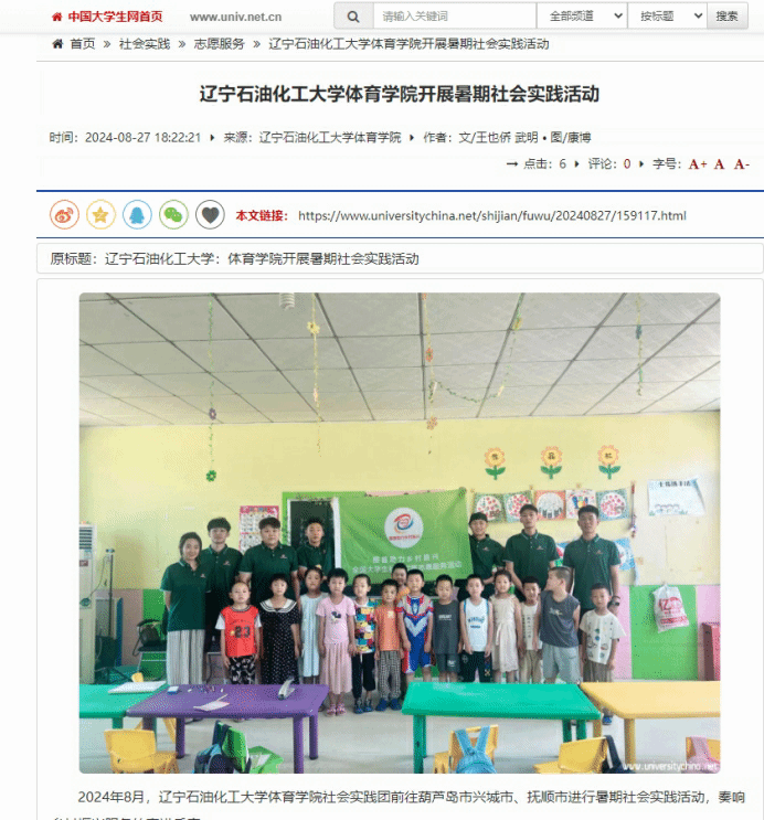 编者按:8月27日,中国大学生网对我校体育学院社会实践团前往葫芦岛市兴城市、抚顺市进行暑期社会实践活动进行了宣传报道。现将相关报道转载如下: