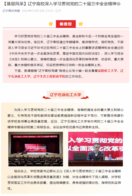 辽宁高校党建微信公众号:【基层风采】辽宁高校深入学习贯彻党的二十届三中全会精神⑫