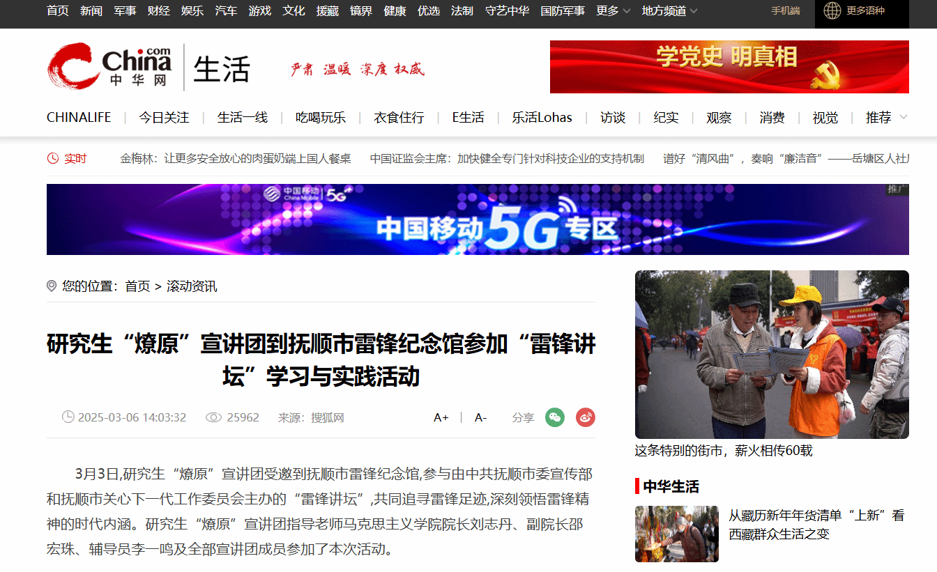 编者按:近日,中华网媒体平台对我校研究生“燎原”宣讲团到抚顺市雷锋纪念馆参加“雷锋讲坛”学习与实践活动进行了转载报道。现将相关报道转载如下: