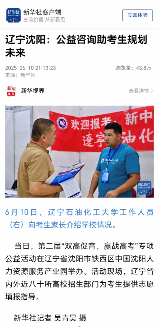 编者按:2025年6月10日,新华社客户端以《第二届“双高促育·赢战高考”公益招生咨询活动在沈阳举行》为题,对我校石油化工学院师生代表参加在中国沈阳人力资源服务产业园举办的高招咨询活动进行了报道。报道聚焦我校教师团队和招生志愿者积极回应考生关切、现场讲解招生政策、展示办学特色等亮点,体现了学校服务考生、拓展宣传渠道、提升社会影响力的积极作为。现将相关报道转载如下: