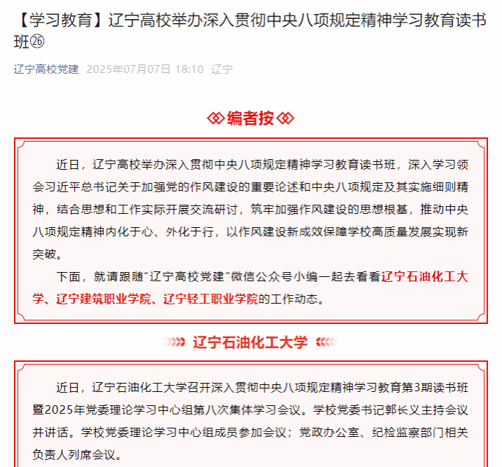 编者按:近日,学校召开深入贯彻中央八项规定精神学习教育第3期读书班暨2025年党委理论学习中心组第八次集体学习会议。辽宁高校党建微信公众号对其进行了宣传报道。现将相关报道转载如下: