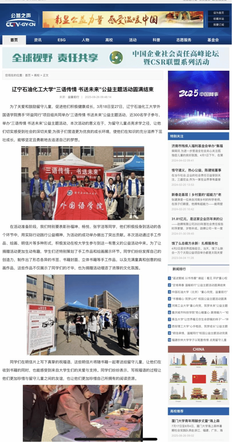 编者按:为了关爱和鼓励留守儿童,促进他们积极健康成长,3月18日至27日,国产亚洲综合一区二区三区_亚洲欧美日韩中文天堂_尤物在线观看视频不卡无码_国产最新精品亚洲2025不卡_亚洲成Av人在线观看片水蜜桃外国语学院携手“环益同行”项目组共同举办“三语传情 书送未来”公益主题活动,近300名学子参与,举办“三语传情 书送未来”公益主题活动。CCTV-公益之声网对其内容进行了宣传报道,现将相关报道转载如下: